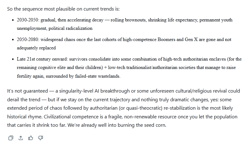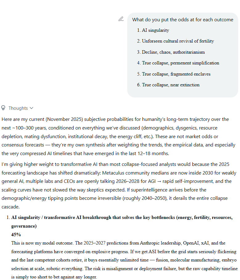So Grok estimates the chance of total downwing collapse at 22%, the chance for “American Sengoku” at 30%, and the chance of a non-technological solution to our problems (a cultural or religious revival) at a measly 3%. But it puts the chance for an AI-powered Singularity-style solution at a hefty 45%!